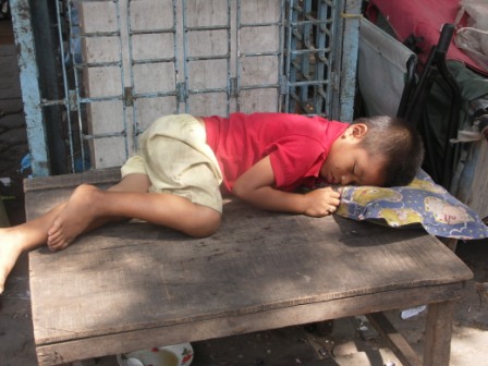 ↑ 外の屋台の隣に縁台で、昼寝をする子供。