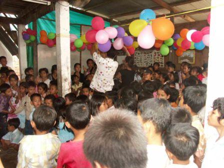 ↑パーティーのスタート直前に風船の飾りつけの総仕上げ。